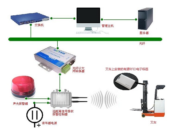 在仓库每一个出入门口,安装一套低频激活器和远距离读写器,激活器带2只天线,分别为1号和2号,各自放置在门口里面和外面,这样,随时随地全方位监控叉车进出仓库的动向,包括时间,地点,叉车相关详细信息等。