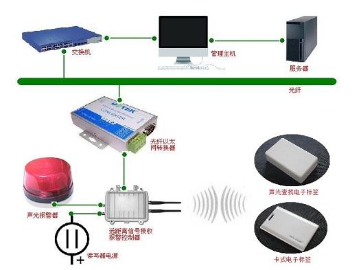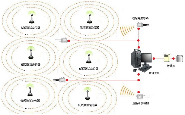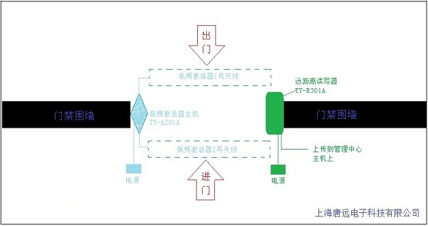 在仓库每一个出入门口,安装一套低频激活器和远距离读写器,激活器带2只天线,分别为1号和2号,各自放置在门口里面和外面,这样,随时随地全方位监控物资进出仓库的动向,包括时间,地点,物资相关详细信息等。